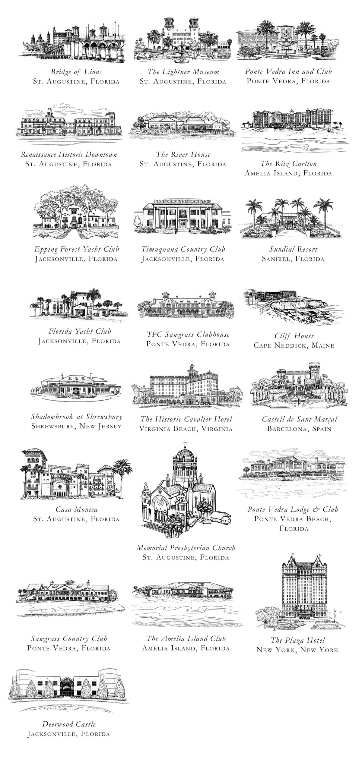 Below is our library of wedding venue sketches that can be used at no additional charge on the Emily Collection Suite. Don't see your venue listed below? No worries, we can create your wedding venue sketch for just $375! You will need to select a venue add on to your order form when placing your invitation order. It will add an additional 7-10 days to your proofing process.